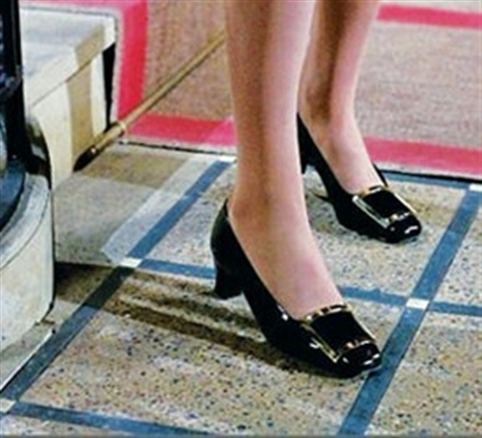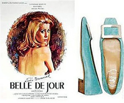 1967年,凯瑟琳·德纳芙,穿着罗杰·维威耶(RogerVivier)的银扣皮鞋,在名垂影史的《白日美人》中有过经典演出。随着这部电影的成功,女主角的造型也成为人们关注的焦点,而那双在电影里出尽风头的鞋子,后来被称为“维威耶美人”(BelleVivier)。设计师将大大的方形银扣缀在鞋头前端,革新传统的皮鞋设计。虽然近代出现了不少类似的设计,但要知道在上世纪60年代,是没有设计师会这样装上鞋扣的。