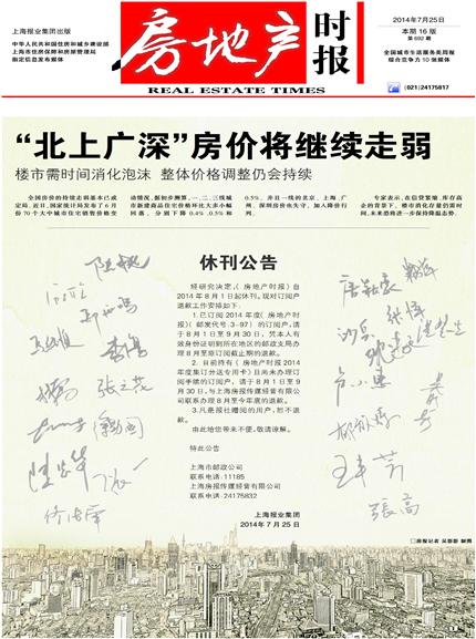 上海报业集团在7月25日出版的《房地产时报》头版发出公告称,经研究决定,《房地产时报》自2014年8月1日起休刊。