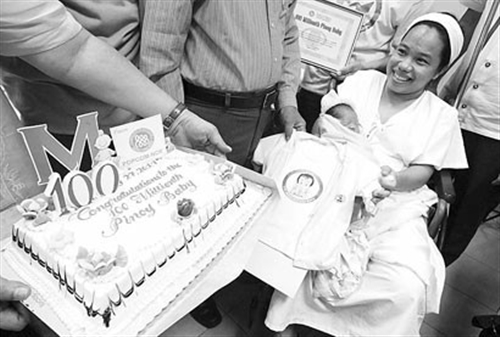菲人口委员会主任佩雷斯介绍,根据菲律宾每3分钟有1名婴儿降生的趋势,他们预测“第1亿宝宝”将在27日凌晨左右诞生。为了迎接这一重要时刻,菲人口委员会27日宣布将在全国各个大区及省、市确定100名“第1亿宝宝”,由地方政府选定1名出生时间最接近0时06分且自然分娩的新生儿作为当地的“第1亿宝宝”。政府向每名婴儿赠送价值5000比索(约合750元人民币)的礼包。