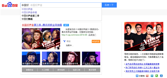 比如,网友在搜索框中输入“中国好声音”的过程中,输入一半时页面便会根据搜索关键词的变化直接跳转至相应的最新结果页“中国好声音第三季”,而网友若想查看的是“中国好声音歌曲”,只需继续输入“ge”,便可得到实时的结果反馈,整个过程无需回车或点击“百度一下”。