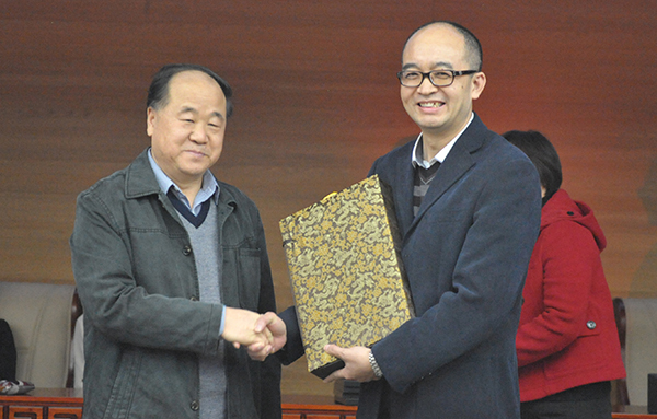 莫言(左)将小说《苍蝇·门牙》手稿交给中国现代文学馆馆长吴义勤。