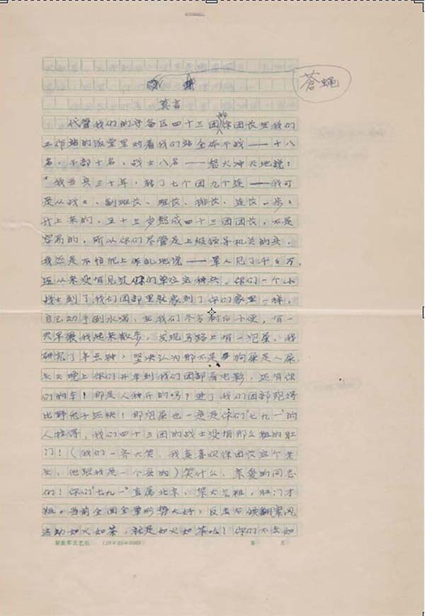 《苍蝇·门牙》手稿共30多页,由钢笔工整誊写在“解放军文艺社”稿纸上,旁有编辑批注。5月中旬,歌德拍卖宣布5月30日歌德春拍的“小雅观心——赵庆伟藏重要名家书稿、手札专场”中,《苍蝇·门牙》本将作为唯一有底价的拍品上拍。歌德拍卖东四环总裁王晓文介绍,当时私洽价格已达400万元。
