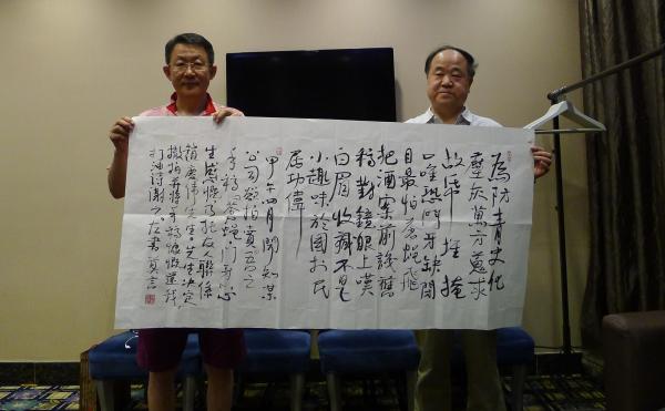 莫言(右)与赵庆伟的合影,为感谢赵庆伟,莫言特地赠诗一首。