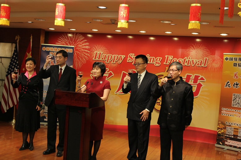 当地时间11日晚,中国驻纽约总领馆在纽约举办2015年新春招待会,美东地区侨学界等代表约600人出席。总领事章启月与其他四位副总领事共同举杯向当地华人华侨送去春节的祝福。