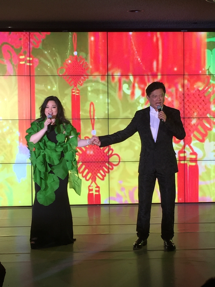 在首届“友谊之桥”中国春晚上,男高音歌唱家莫华伦和女高音歌唱家黄英联合演出。
