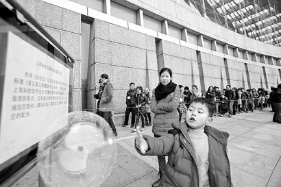 《上海科技馆最大承载量公告》被放在了排队等候区域的醒目位置。 本报记者 叶辰亮 摄