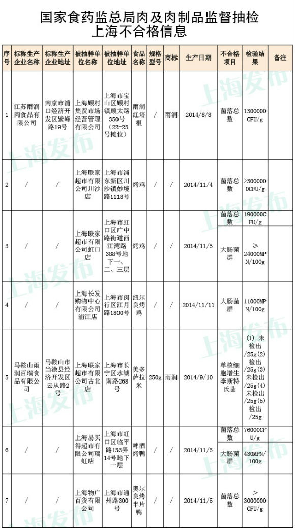 国家食药监总局公布了2015年第2期食品抽检信息,其中,上海家乐福川沙店和虹口店的烤鸡,长发购物浦江店的纽尔良烤鸡、易买得瑞虹店的啤酒烤鸭等7家市场相关批次肉制品不合格,主要涉及菌落总数、大肠菌群不合格等。