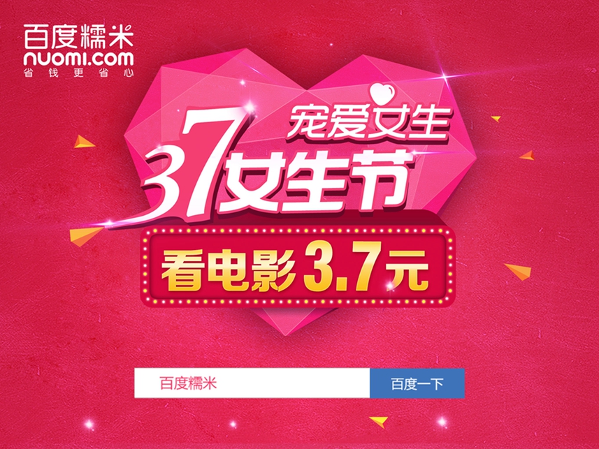 据悉,在今年的“3.7女生节”,百度糯米提出“宠爱自己、任性有理”口号,女生们只要在百度糯米上购买3月7日当天的电影票,即可享受由专业男模提供的咨询指导、取票乃至全程陪伴的观影服务,(活动详情参见:http://dianying.baidu.com/info/operation/operation_topic?bdmovie_from=pc_nsj&act_id=183&sfrom=newnuomi&sub_channel=pr_text_pc)。