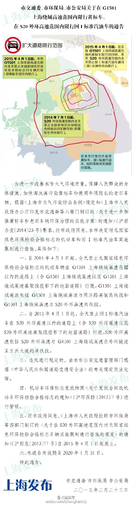 司机朋友看过来。@上海交通 发布,4月1日起,无国家绿色环保检验合格标志的机动车辆(即黄标车)在G1501上海绕城高速范围以内的道路(含绕城高速)全天禁止行驶;国I标准汽油车,在S20外环高速以内的道路(含S20外环)全天禁止通行。