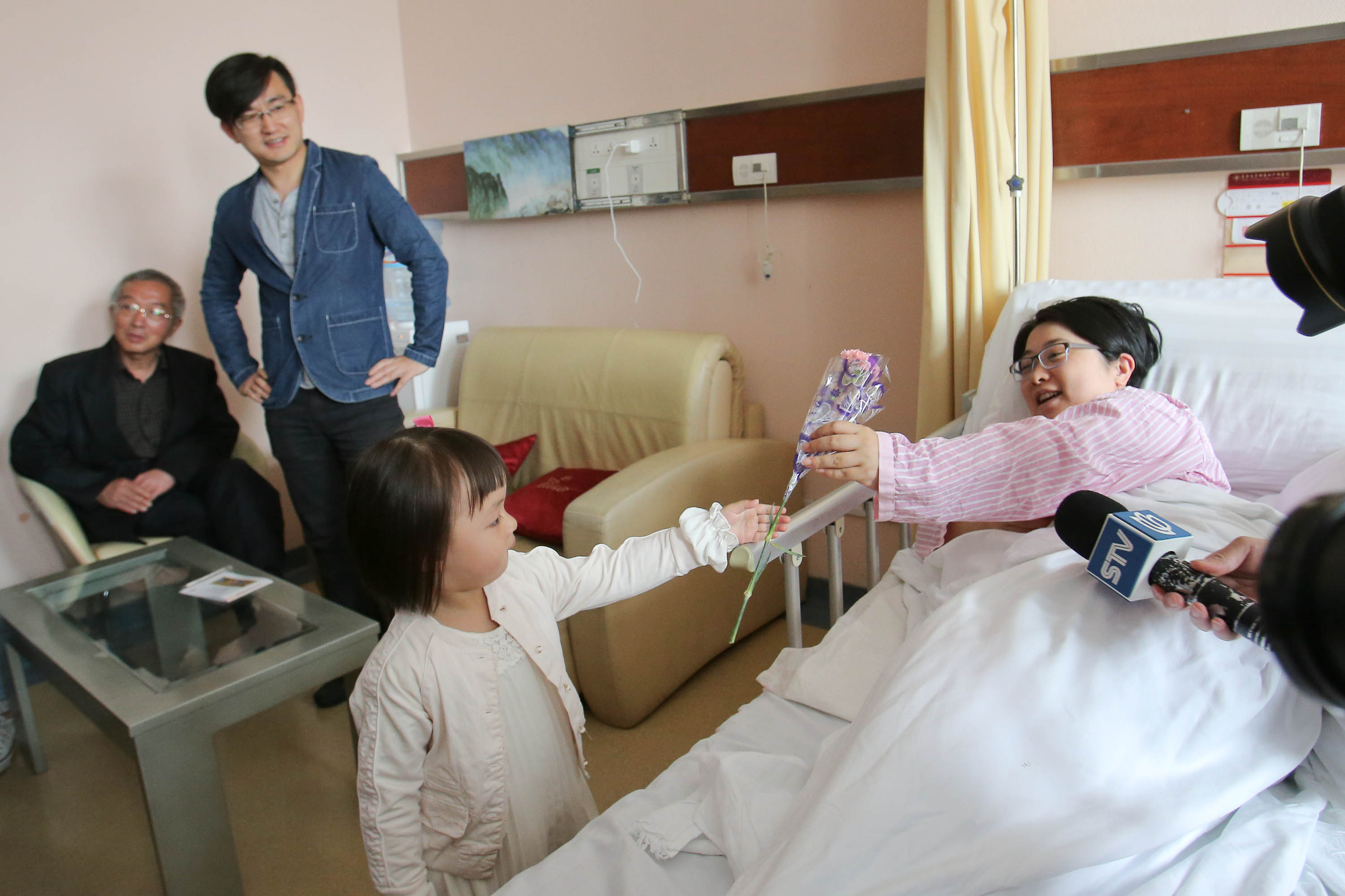 (在产科病房内,前来参加活动的小朋友向初为人母的新妈妈送上康乃馨,为新妈妈送上节日祝福。)