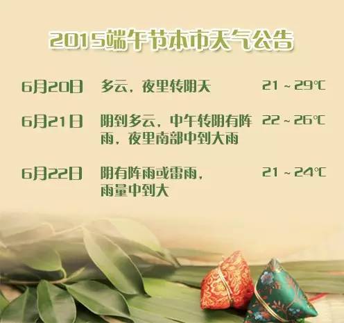 今明两天,梅雨带南压到江南中部地区,上海出现降水间歇,转为多云为主的天气。预计最高在28-29℃左右。明天迎来传统的端午佳节,并且是三天小长假中唯一无雨的一天。端午小长假中后期预计过程累积雨量又可达大雨到暴雨程度,并可能伴有短时强降水和雷电,降雨主要时段会是周日夜间到下周一白天。