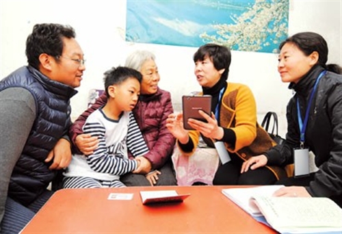 昨日,河北邢台市桥东区团结东社区人口抽样调查员马建芳(右二)在居民家调查登记。