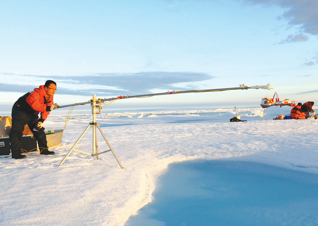 我国北极科考队员正在观测由气候变暖导致的冰面变化情况。(中国极地研究中心供图)