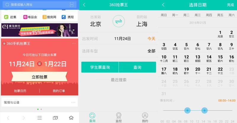 文汇网讯(记者张晓鸣)2016年春运购票期如约而至,各互联网企业纷纷启动了“抢票模式”,推出了各家的抢票工具来招揽用户。360浏览器技术人员建议,在手机网速与电脑网速一致的情况下,建议用手机抢票成功率更高。