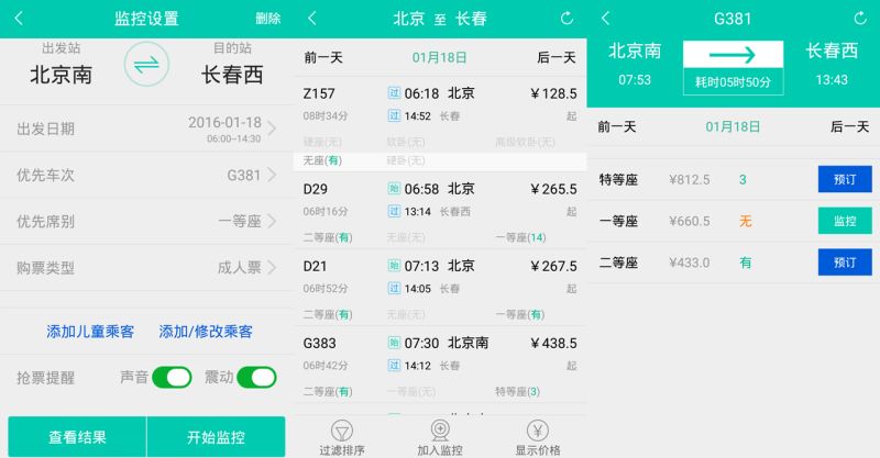 选好有意购买的车次之后,即可将该车次加入监控。在监控设置界面我们可以勾选优先车次、优先席别、添加乘车人身份信息及添加儿童乘客等设置,同时还可以选择声音及震动提醒,点击开始监控后360手机抢票王会为我们自动刷票。