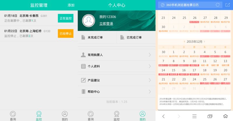 在360手机抢票王的入口下方还有抢票日历及我的订单等快速入口,通过抢票日历可以方便的查阅车票的开售日期,而在我的订单界面可以查询订单、设置购票人身份信息、资料等。值得一提的是360手机抢票王提供了12306验证码自动识别功能,可以帮助用户自动勾选图片验证信息,大大方便了视障人士及不常使用电脑的用户。