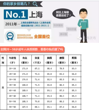国家体育总局今天发布的2014国民体质监测公报显示,上海市民最爱运动,在两项最重要的核心数据中均列全国第一,其中体质达标率达到97.1%,体质综合指数高达107.91。就全国来说,20-24岁男子和女子的平均身高分别是1.719米、1.599米,体重分别为67.2千克、53.8千克,你拖后腿了吗?