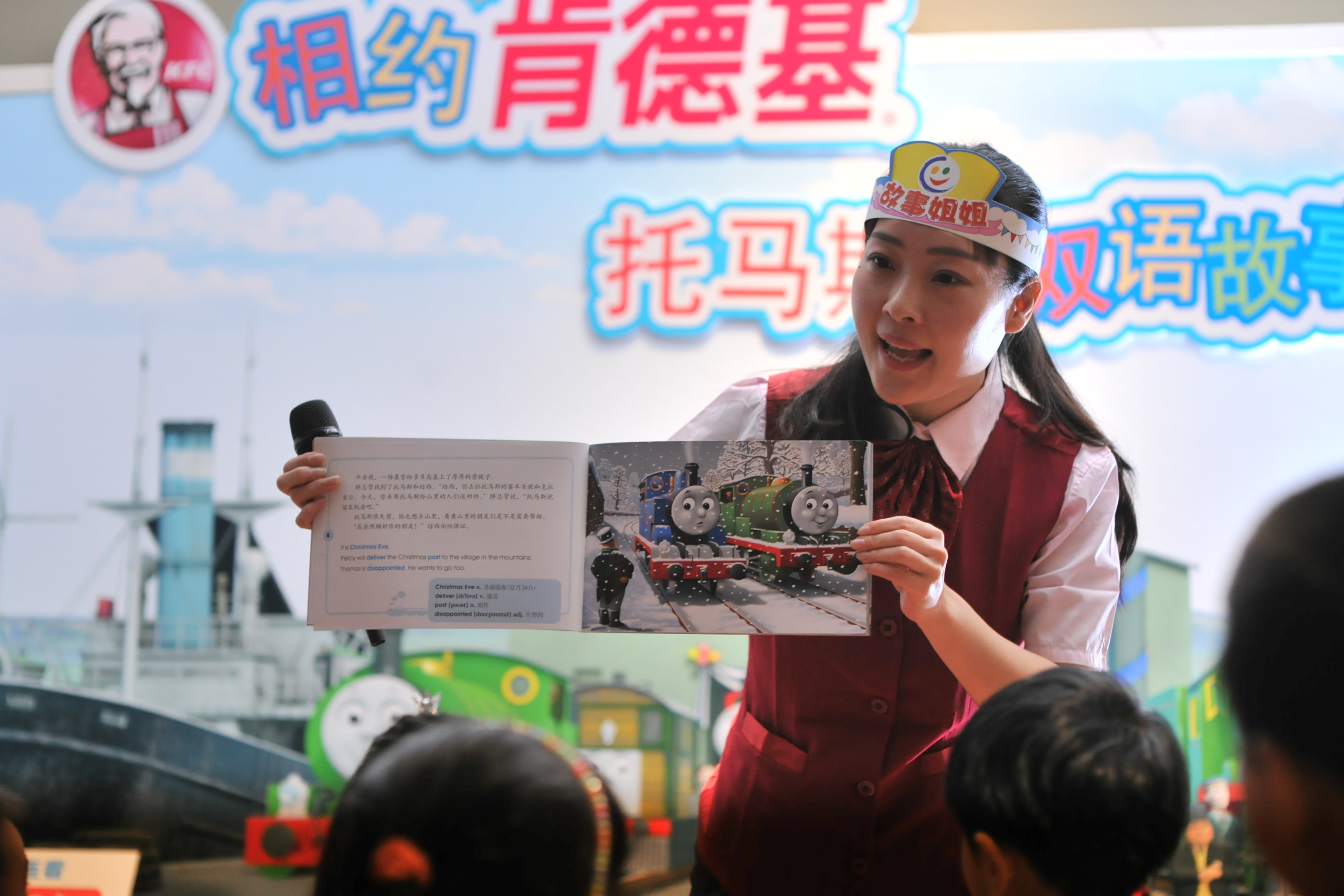 肯德基故事姐姐手拿《托马斯双语成长故事》,给小朋友们讲故事