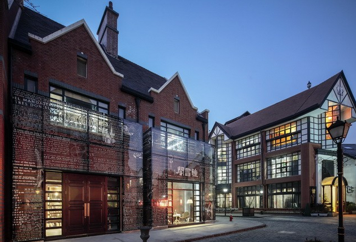 钟书阁位于以英伦异国情调闻名的泰晤士小镇,树影下的石板路,哥特式教堂与维多利亚式的露台总是让人恍惚漫步在欧洲。钟书阁位于街角转弯处,仿欧式殿堂的正门毫不突兀地融入街景,高高矗立的飞檐与“钟书阁”中文铭牌又使它气势十足地显出自身的存在,两侧的玻璃幕墙上镌绘着来自世界各国书本里的精选段落,不同的语言与文字,作为一间海纳百川的书店装饰再合适不过。