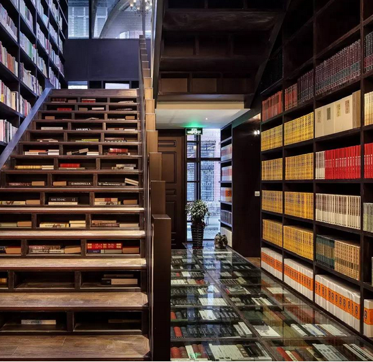 从透明玻璃地板下的书格到两侧如图书馆一般高高耸立的书架,满满当当的陈列让人直观感受到书海的气势。