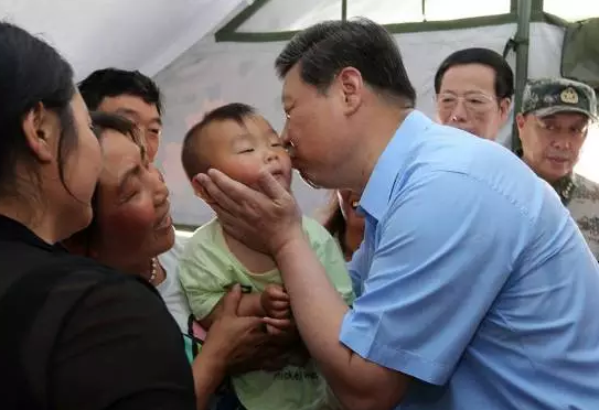 2013年5月21日,四川芦山地震灾区,习近平总书记在芦山县体育馆安置点一帐篷内亲抚一个小孩。 新华社记者兰红光摄