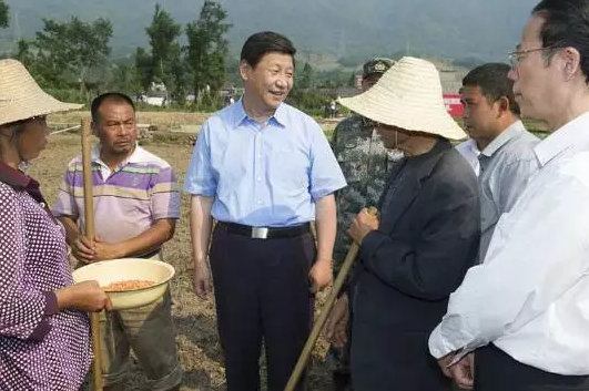 2013年5月21日,习近平在四川芦山县龙门乡青龙场村的农田同正在播种玉米的村民亲切交流。 新华社记者黄敬文摄