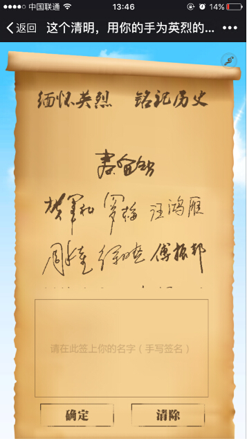 团中央书记处全体领导同志通过亲笔签名的方式参与清明祭英烈活动。图为“清明祭英烈 共铸中华魂”手机端活动页面截图。