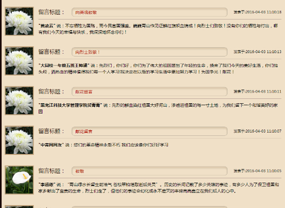 在“清明祭英烈 共铸中华魂”活动主网站上,网友参与献花留言。图为部分留言截图。