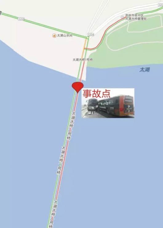今天中午12点左右,苏州太湖大桥一号桥桥面上发生一起两车事故,一辆是58路公交车,另一辆是上海牌照大客车。
