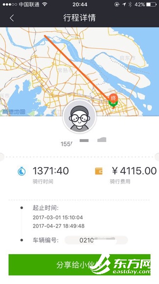 东方网记者王佳妮5月3日报道:从龙华医院到徐汇区中心医院,约5公里的骑行路程竟然花费4000多元!近日,市民刘先生致电东方网新闻热线,称共享电动自行车享骑出行在“临时锁车”的状态下,由于没电而无法解锁,最终导致其账户的骑行时间达1371个小时,随之而来的租车费也一路飙升至4115元。