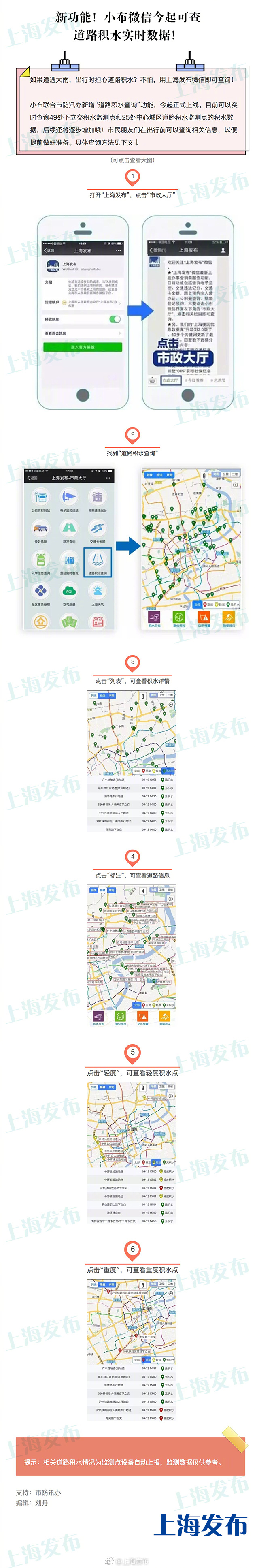 【新功能!小布微信今起可查道路积水实时数据!】#便民提示#如果遭遇大雨,出行时担心道路积水?不怕,用上海发布微信即可查询!小布联合市防汛办新增“道路积水查询”功能,今起正式上线。目前可以实时查询49处下立交积水监测点和25处中心城区道路积水监测点的积水数据,后续还将逐步增加哦!市民朋友们在出行前可以查询相关信息,以便提前做好准备。具体查询方法见下文↓
