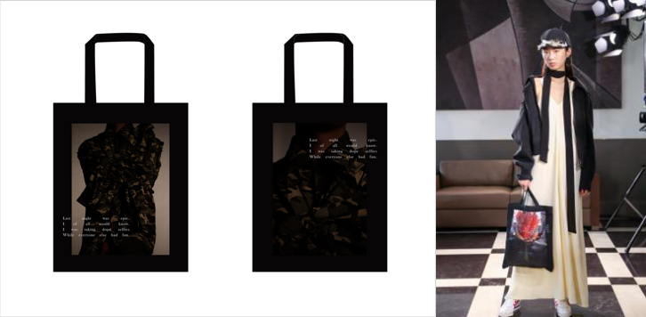 本次“丰尚季”,奕欧来与潮流男装品牌XANDERZHOU独家合作推出限量款totebag。作为享誉全球的男装设计师品牌,XANDER ZHOU的设计一直与众不同,此次推出的环保购物袋设计灵感来自于设计师对当下年轻人的观察。图像与文字的交叠在形式上体现出社交媒体的虚拟与现实的对冲,视觉内容上则以幽默的方式影射出青年群体现今的生存状态。这些主题再与消费和环保联系起来,构成一个完整的社会时代语义场。