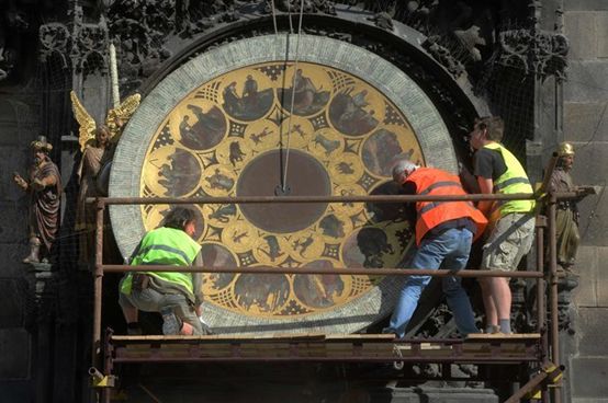 它就是布拉格老城里著名的天文钟Orloj,现在被暂停了工作进行修复。说起这座大钟,它已经不是第一次停止运行了,由于它年事已高,身体脆弱,所以每一次的维修都似乎充满了风险,让人忧心重重。而这一次的维修是近年来最为复杂的,所以这对布拉格的钟表大师佩特·斯卡拉(Petr Skala)来说,有点像给一位年迈的病人实施手术。
