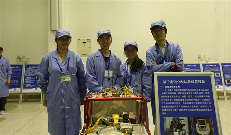 ▲研制队伍与天宫二号上的小型化量子终端(技物所供图)