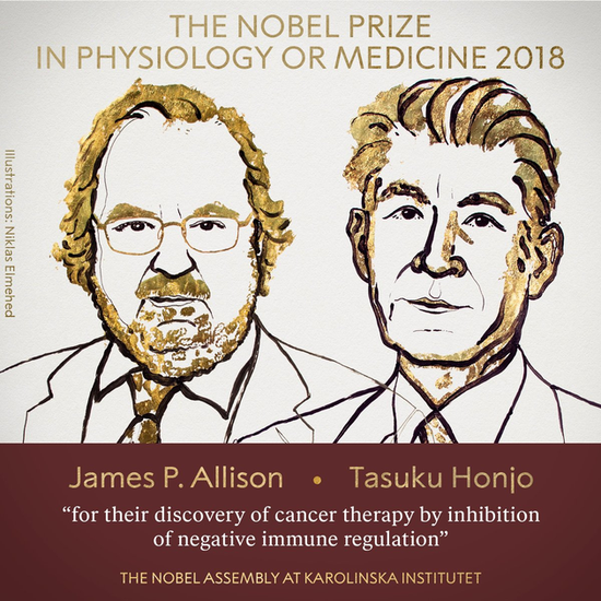 北京时间10月1日下午5点32分,瑞典卡罗林斯卡医学院(Karolinska Institute)公布了2018年诺贝尔生理学或医学奖获奖者名单:美国得州大学MD安德森癌症研究中心免疫学家詹姆斯·艾利森(James P.Allison) 和日本京都大学教授本庶佑 (Tasuku Honjo)获奖。获奖理由是for their discovery of cancer therapy by inhibition of negative immune regulation“他们对肿瘤负性免疫调节的抑制治疗方法”。据悉,两人被誉为“免疫疗法先驱”,将均分900万瑞典克朗奖金。