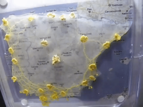 下面是黏菌正在“设计”的西班牙的高速公路网。