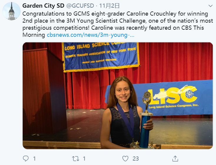 获奖之后,这位小菇凉收到了来自母校在 Twitter 上的点名表扬。