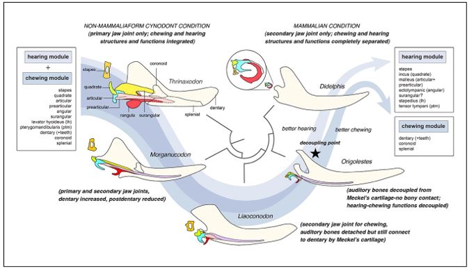 从形态功能上来说,分离的听觉和咀嚼模块,消除了两者之间互相干扰的物理制约因素,增加了两个模块演化和多向适应的可能性;听觉器官具备了向高灵敏度高频听力发展的潜力,咀嚼器官也获得了牙齿和咬合方式多样性演化以摄取不同食物的可能性。