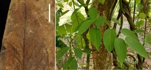 ▲西藏芒康发现的鼠李科新化石——君容似勾儿茶叶(Berhamniphyllum junrongii),以及现生长梗勾儿茶(Berchemia longipes)