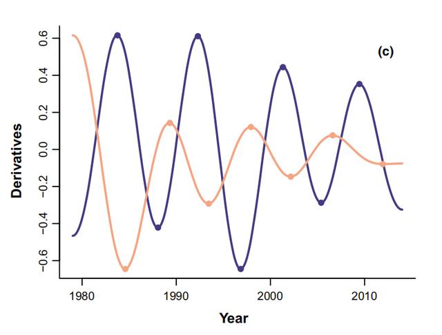 排除其他环境因素的干扰,他们分别尝试用夏季平均温度、冬季平均温度和冬季总降水量来预测鸟类体型的变化,发现其中夏季平均气温的变化趋势能较好地预测鸟类体型变化情况。