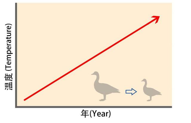 不同的鸟类物种体型都发生了变化,可能是某种大尺度的环境改变造成的。研究团队猜测这可能和全球气候变暖有关。于是,该团队进一步探讨了鸟类体型变化与气温变化的关系。