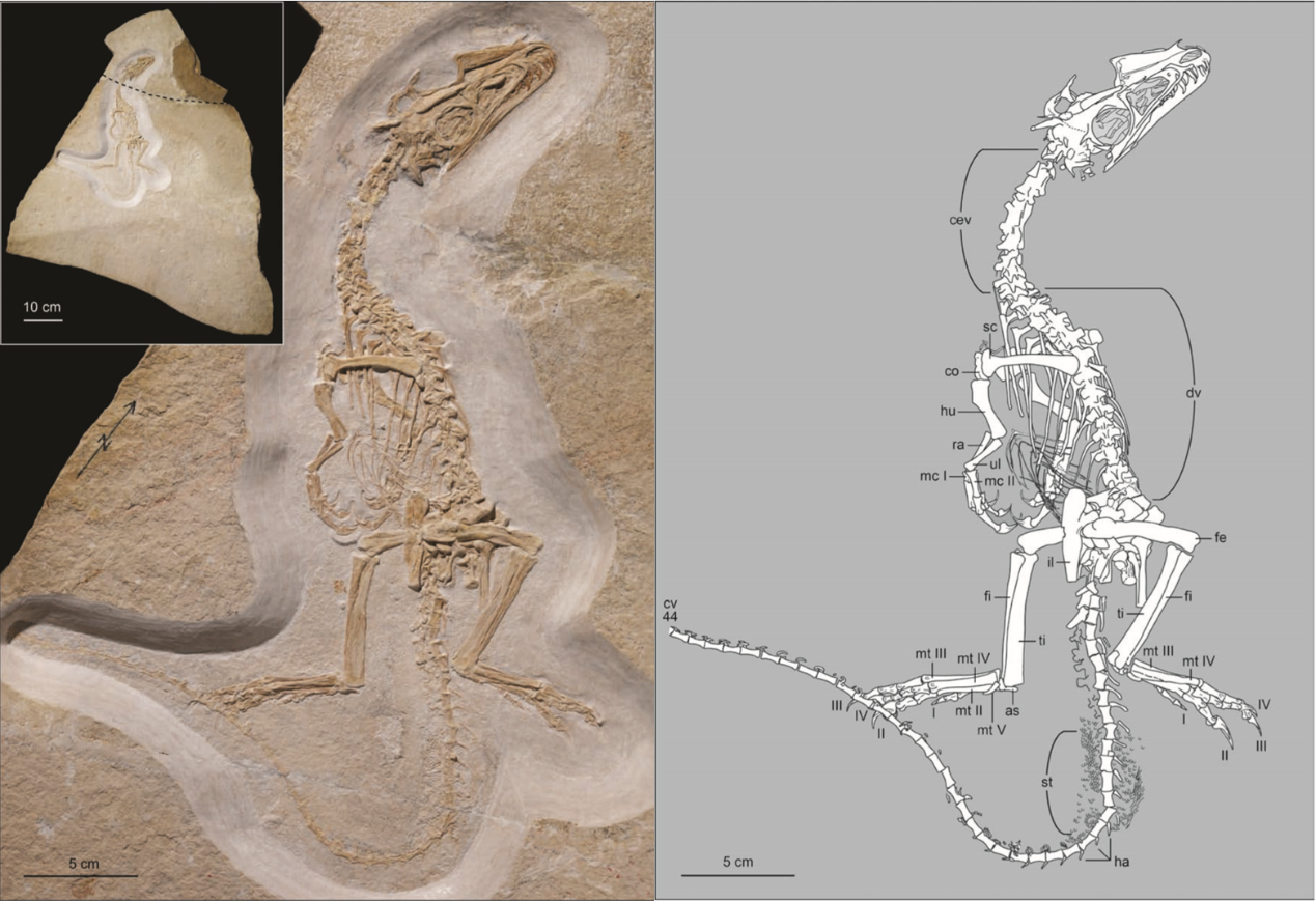 侏罗猎龙的化石照片和解释图,鳞片痕迹位于尾部st指示区域。(图源参考文献[1])