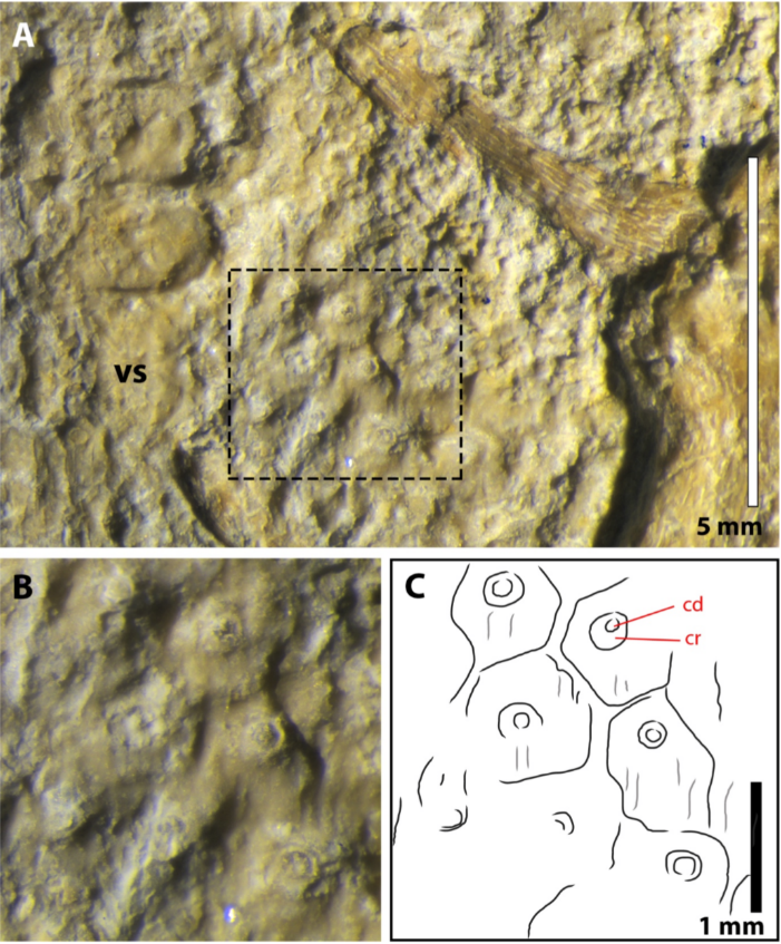 (A)(B)侏罗猎龙尾巴的独特鳞片特写;(C)为解释图,可见明显的突起小圆点,并呈同心环状结构。(图源参考文献[2])