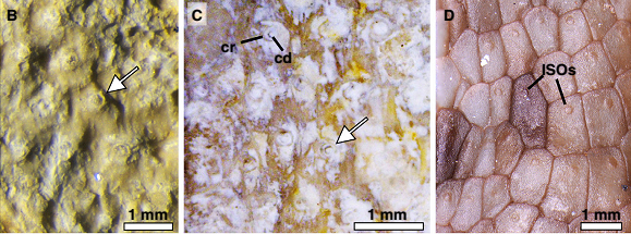 (B)(C)为侏罗猎龙的鳞片特写,箭头所指为小圆点;(D)现代鳄鱼的鳞片特写,同样可见小圆点(ISOs)。(图源参考文献[2])