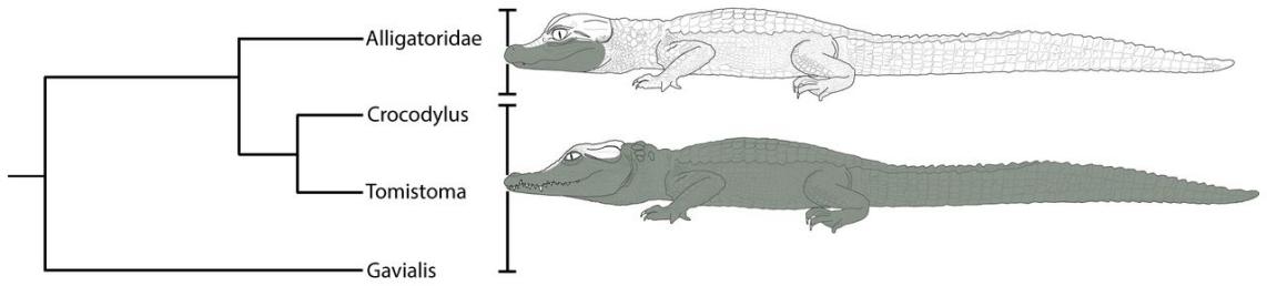 阴影区为皮肤感觉器官(ISOs)的分布区域,短吻鳄科仅限于头部区域,其它鳄类则从头到脚均有ISOs。(图源参考文献[3])