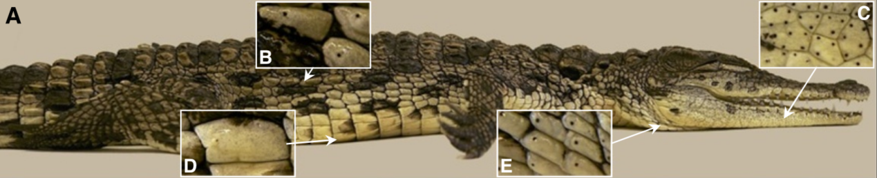 幼年尼罗鳄背部、面部、腹侧和颈部鳞片上的皮肤感觉器官(ISOs)(图源参考文献[4])