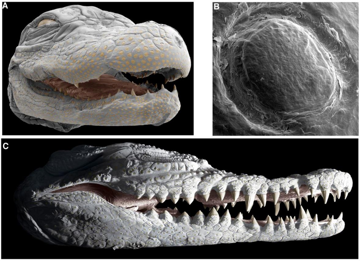扫描电子显微镜下的鳄鱼头:(A)黄色为ISOs;(B)一个放大的ISOs;(C)幼年尼罗鳄头部的ISOs分布区域。(图源参考文献[3])