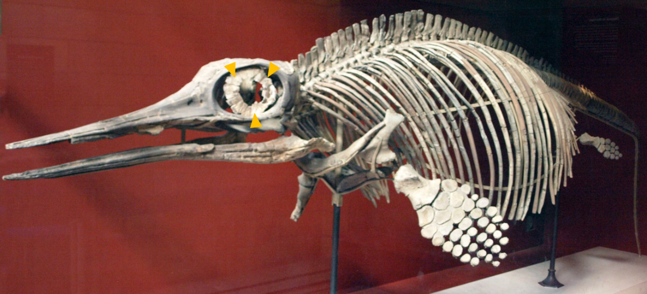 大眼鱼龙骨骼,黄色箭头指示为巩膜环。(图源wikipedia)