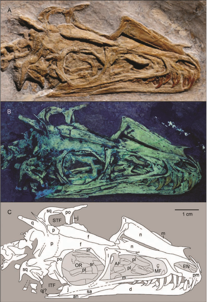 (A)正常光的侏罗猎龙头骨;(B)紫外线;(C)解释图,sr为巩膜环,可见大比例巩膜环和眼眶。(图源参考文献[1])