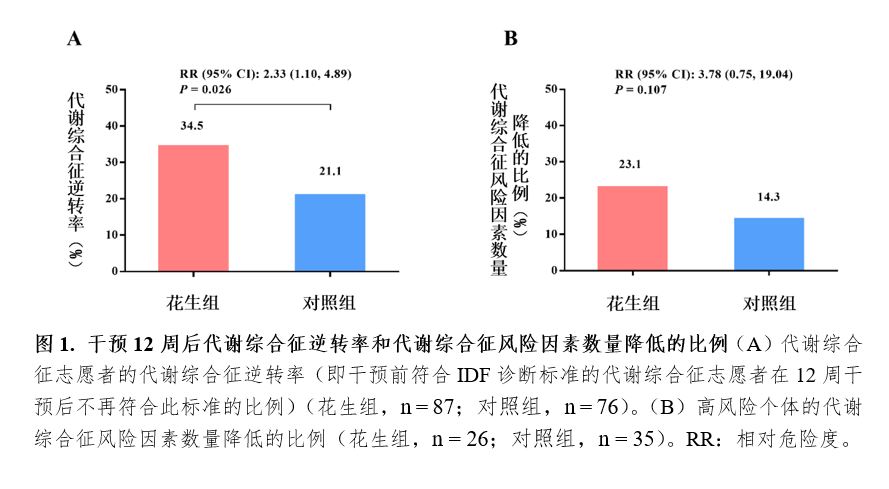 1)代谢综合征逆转率(即干预前符合IDF诊断标准的代谢综合征志愿者在12周干预后不再符合此标准的比例),花生干预组是对照组的2.33倍 (RR 2.33; 95% CI: 1.10,4.89; P = 0.026)(图1A);